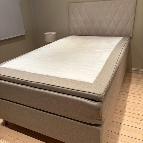 Hitra rammeseng 120x200 Medium i tekstil Gina Creme med SCS 1 overmadrass. Scs ben nordisk 23 cm hvitoljet. Selges med sengegavl.
