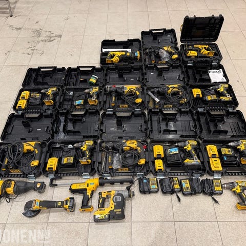 Dewalt el-verktøy og tilhørende utstyr som vist på bilder. Inneholder både batteridrevne og ledningsdrevne maskiner, samt arbeidslys, byggstøvsuger og kabeltrommel.🔹 Dewalt borhammer