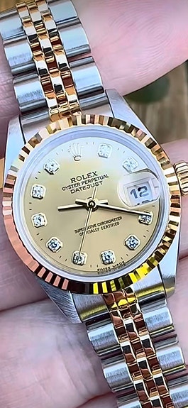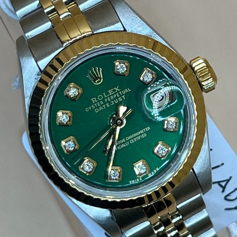 Rolex Lady Datejust med den tidsriktige og populære Jubilee lenken. Veldig fint eksemplar Rolex lady datejust, klokken har rosa am skive med 10 diamanter. Kjempefin skive og farge på denne. Klokken kommer komplett med boks og sertifikat.