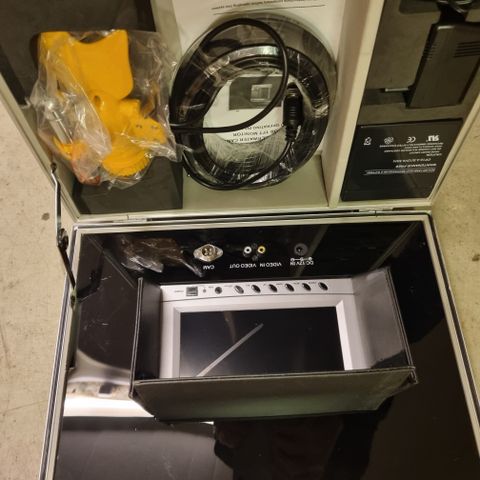 Pakken inneholder: Plastkoffert til alt utstyret, monitor, undervannskamera med 50 meter kabel, fjernkontroll til monitor, oppladbart batteri, nødvendige kabler og brukermanual.