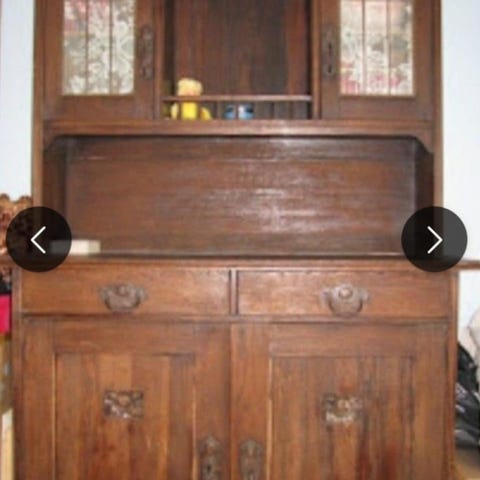 En dejlig enkel skænkskap i lysegrå ,slidt,maling.Indretning med hylder.Overdelen har oprindelig siddet derpå,men er frigjort og kan bruges for sig selv, eller hænges ovenover.Prisen er for begge 2 samlet.
