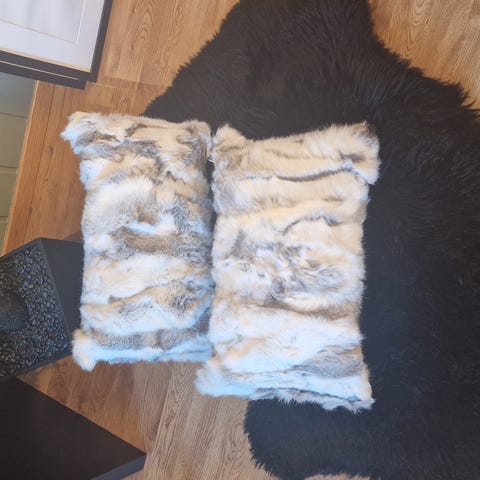 Gylden brun kvadratisk pute laget av skinn fra kanin, naturlig og tidløs i behagelige lyse brun og gråtoner.