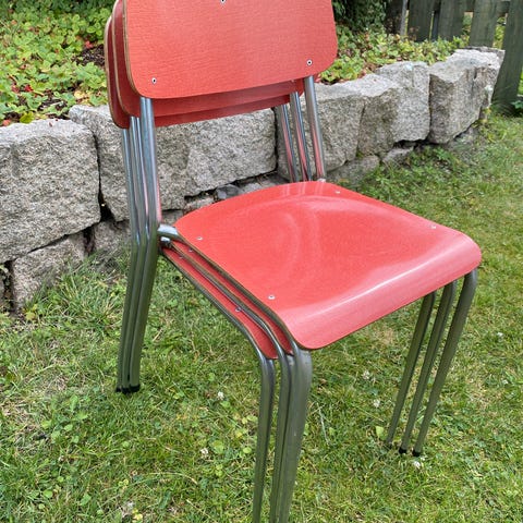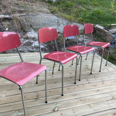 Retro rørstoler med sitteplate og ryggplate i finer. Trolig fra 1970 tallet ? Sittehøyde på 45 cm.