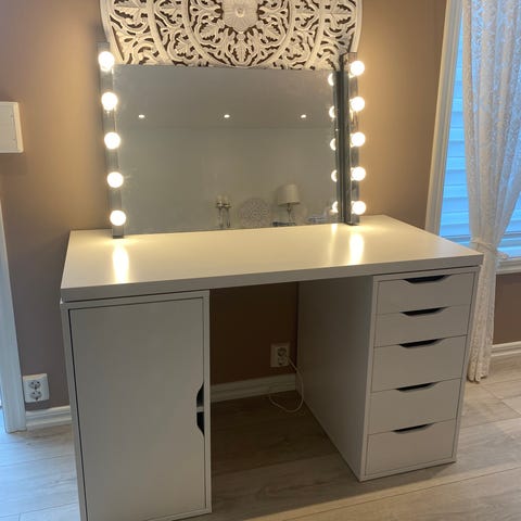 Dette baderoms bordet vil bare gjøre vakkrere soverommet eller garderoben din! Det er to skuffer på toppen av hver side som holder dine verdisaker inne. I tillegg, vil du finne to i full størrelse skuffer på den nedre side av bordet for en ekstra lagringsplass. Skuffene kan enkelt fjernes for rengjøring. Den myke hvite finishen og de buede ben gir glans og eleganse til den. Denne listen er for ett sminkebord. Sjekk våre andre produkter for en passende krakk, speil og mer! Vær oppmerksom på at siden dette møbelet er håndlaget, laget av treverk og malt, det kan skje at det har en liten defekt.