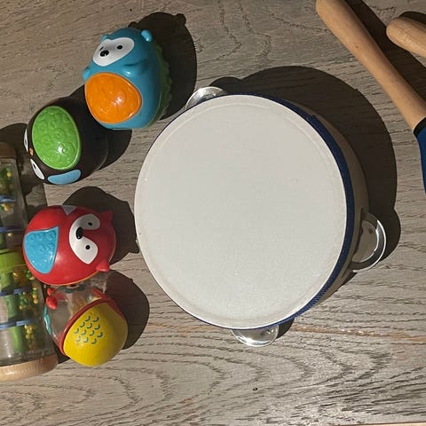 Musikksett i 6 deler. Med 4 ulike instrumenter designet med blomster. Spill Xylofon og legg til rytmer med medfølgende rytmeinstrumenter. Flott lagringseske i tre følger med.
