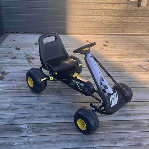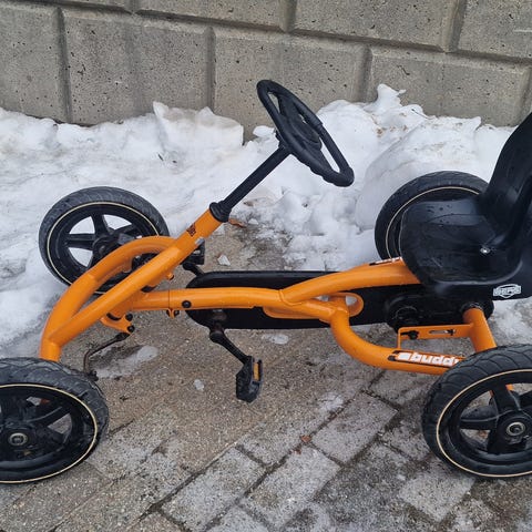 Solid metall gokart med to seter. Gokarten har en beskyttet kjede og kan kjøres også bakover. Gokarten har også et friløp, kulelager hjul, en håndbrems og et tau. Setet kan justeres i mange forskjellige posisjoner, noe som gjør den go-karten å passe til barn som er eldre enn 5 år.
