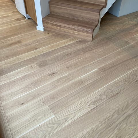 Vi er kjempefornøyd! Golvet holder seg lyst og fint og det er veldig lett å rengjøre. Bjørka er så hard at det er ingen riper eller