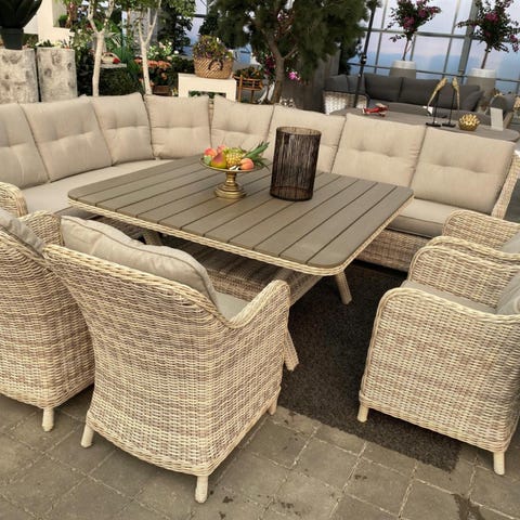 Stor og romslig sofagruppe fra modulserien Moonlight. Gruppen er satt sammen av en treseter sofa, en toseter sofa, et rektangulært kaffebord, to lenestoler og en fotskammel. Gruppen er laget av vedlikeholdsfri rotting i særdeles høy kvalitet. Rottingen er gjennomfarget og aluminiumsrammene er helsveisede.