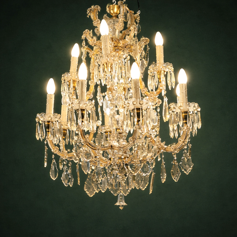 Vakker prismekrone fra Nordtyskland.Høyde 76 cm.6 lysarmer til stearinlys og 6 lyspunkter som er montert inne i kronen da vi restaurerte lysekronen.Lysekronen er i topp stand.Vi har eget verksted for renovering og restaurering av lysekroner.Alle våre lysekroner har nytt elanlegg og er knytt om på nytt.