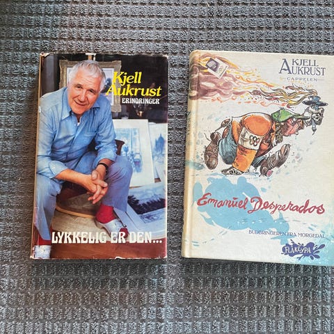 Bok med vareomslag. 222 + 2 sider. Rikt illustrert. Vedlagt avisutklipp fra VG om kjell Aukrust død. Flere sider + forside. (365 kr)