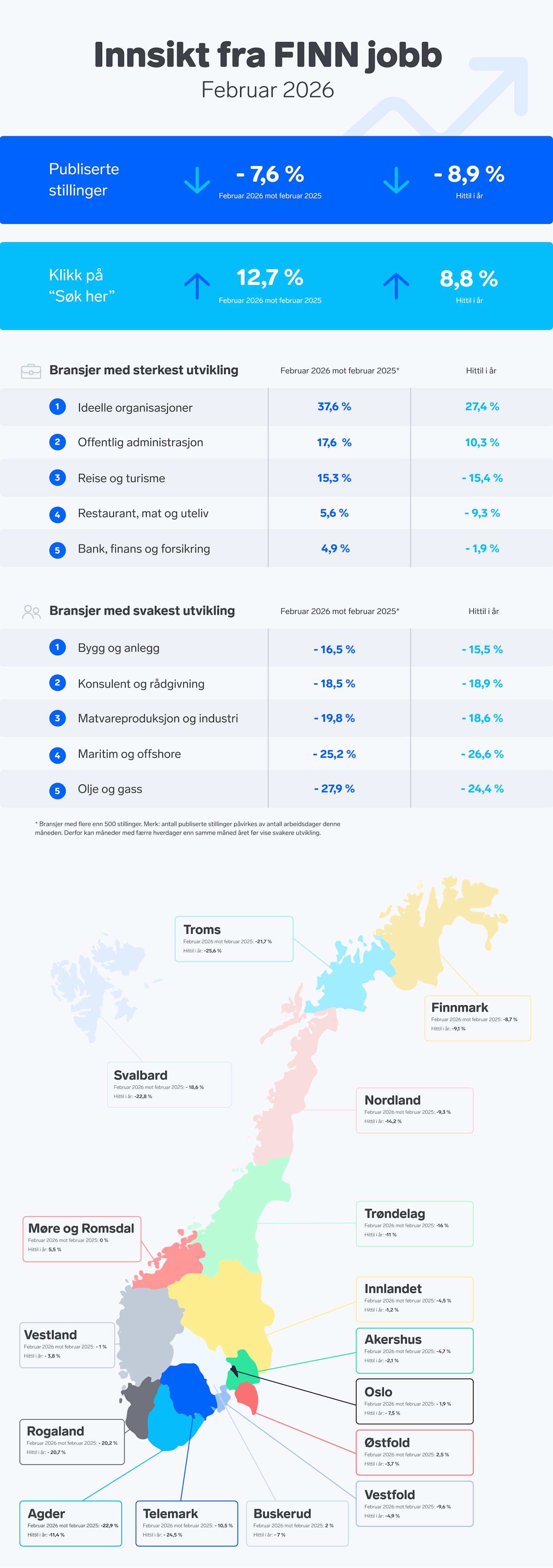 Februar-tall fra FINN jobb viser at det ble publisert 7,6 prosent færre stillingsannonser enn samme måned i fjor. Det er stillinger innen ideelle organisasjoner som tar et stort hopp, mens det er lav etterspørsel inne olje og offshorebransjen.