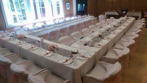 Stoltrekk, setetrekk, chair cover, sløyfebånd,duker, runde duker, avlange duker, damask duker, bordtrekk, musikkanlegg, rød løper, mikrofon, høytalere, høytaler, vaser, glass, vinglass, tallerken, tallerkner, bestikk, gullbestikk, bordbrikker, gullstoler, tiffany stoler, chiavari stoler, Tiffany hvite stoltrekk, svarte stoltrekk, stoltrekk med og uten armlene. 30 ulike farger på sløyfebånd: Hvit, svart, gull, sølv, ivory, krem, gul, lys blå, mørk blå, kongeblå, marineblå, lys grønn, mørk grønn, mosegrønn, mintgrønn, turkis, orange, rød, burgunderrød, lys lilla, mørk lilla, lavendel, syrin