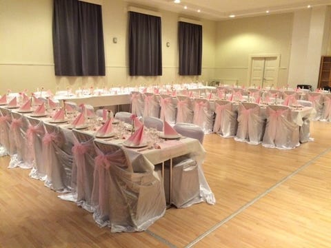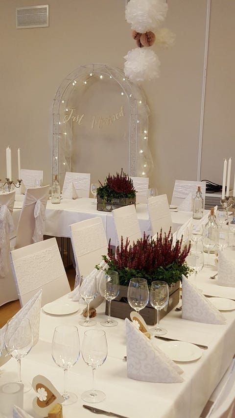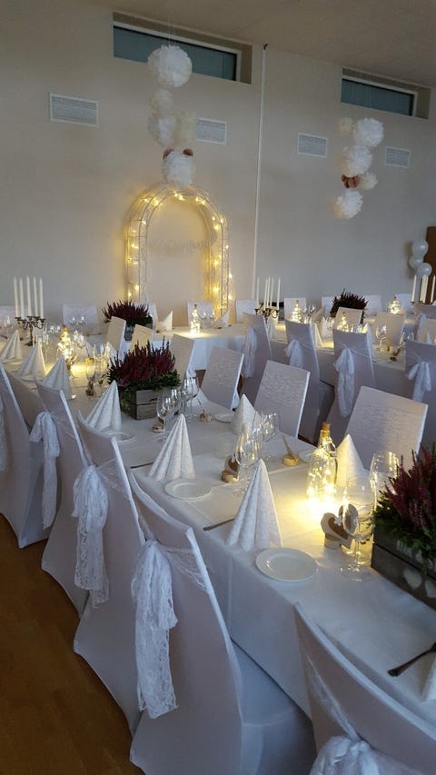 Stoltrekk, setetrekk, chair cover, sløyfebånd,duker, runde duker, avlange duker, damask duker, bordtrekk, musikkanlegg, rød løper, mikrofon, høytalere, høytaler, vaser, glass, vinglass, tallerken, tallerkner, bestikk, gullbestikk, bordbrikker, gullstoler, tiffany stoler, chiavari stoler, Tiffany hvite stoltrekk, svarte stoltrekk, stoltrekk med og uten armlene. 30 ulike farger på sløyfebånd: Hvit, svart, gull, sølv, ivory, krem, gul, lys blå, mørk blå, kongeblå, marineblå, lys grønn, mørk grønn, mosegrønn, mintgrønn, turkis, orange, rød, burgunderrød, lys lilla, mørk lilla, lavendel, syrin
