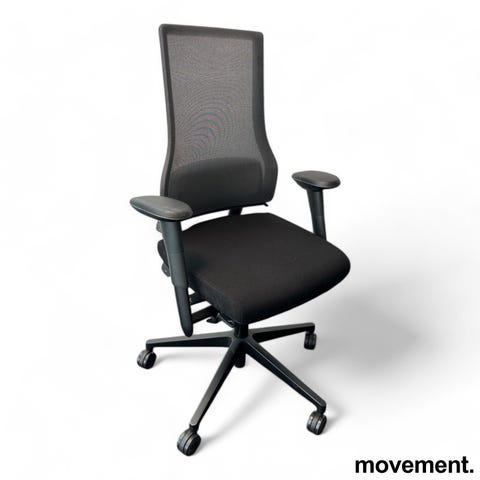 Kontorstol fra Martela, modell Axia 2.0, sort stoff / mesh rygg, armlener, pent