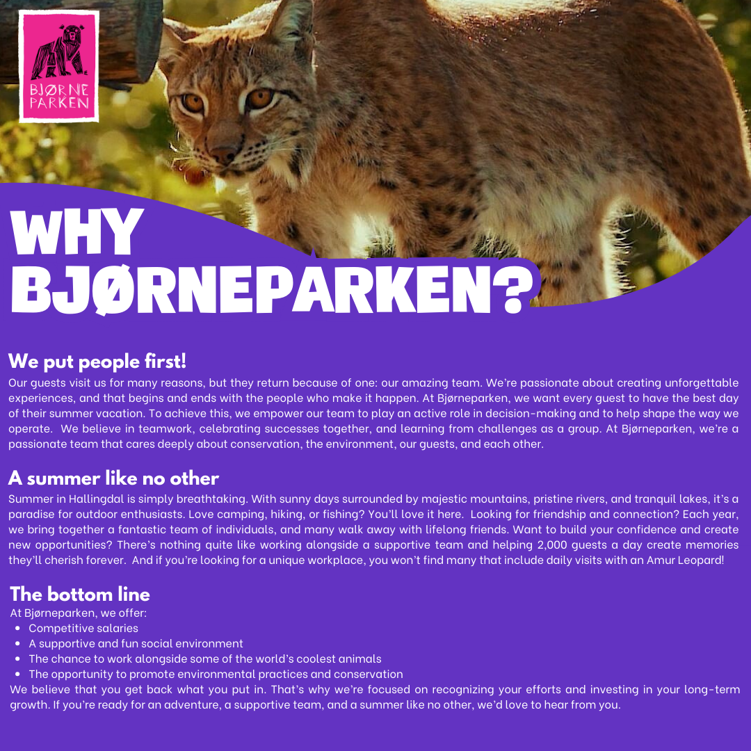 Bjørneparken ligger i Flå, kun 90 minutter fra Oslo og midt i vakre Hallingdal. Vår viktigste ressurs er våre ansatte, som bryr seg om dyrene og gir unike opplevelser i verdensklasse for våre gjester.
