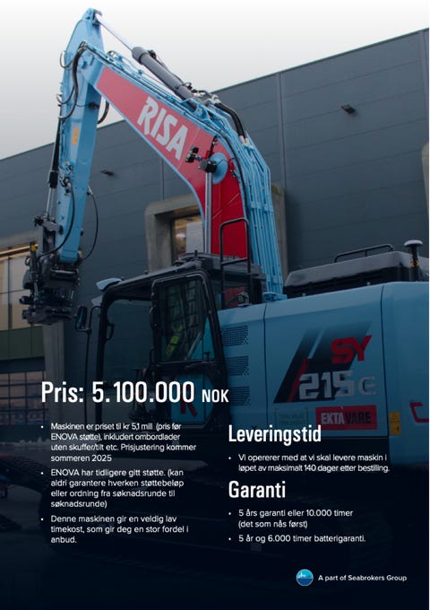 Betalt plasseringSany SY215E Elektrisk 23t. Markedsleder i 202520255 100 000 krSandnes ∙ Seabrokers Heavy MachineryForhandler3.12.25Legg til som favoritt.