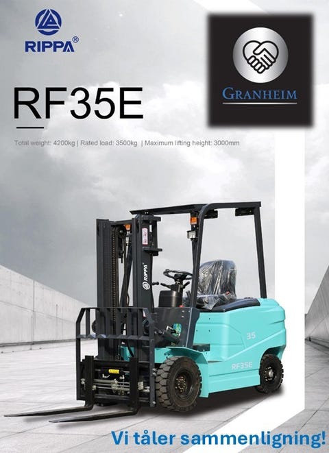 Rippa RF35E – Elektrisk gaffeltruck 3,5 tonn / 4,5 m løftehøyde / sideskift og gaffelspreder2026183 688 krÅl ∙ GranheimForhandler28.12.25Legg til som favoritt.