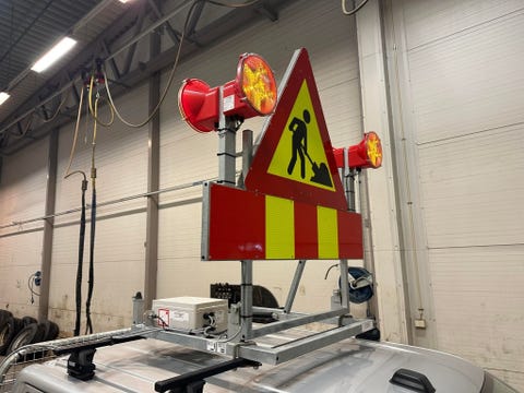 Buffalo Road Safety Takskilt for montering på takstativ eller rails, Passer Lastebiler, maskiner og biler. Styres av 12 eller 24 volt strømforsyning. Elektrisk hev/senk