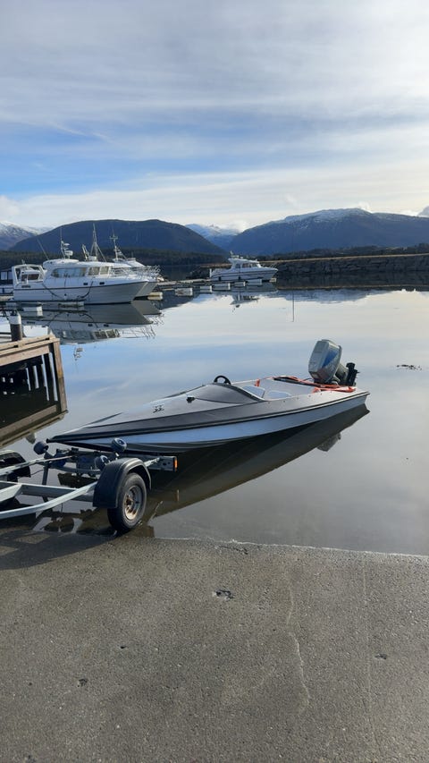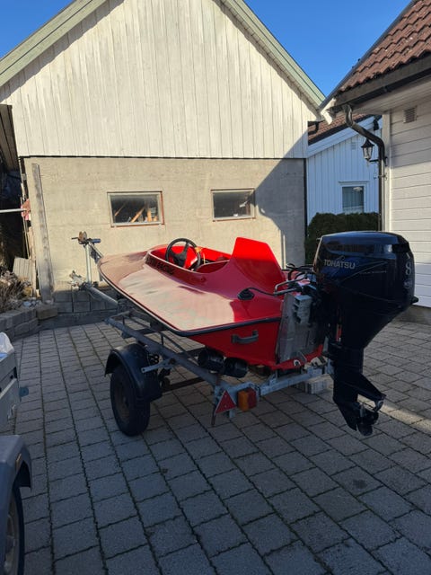 Rå 13 fots Skater med 50hk Tohatsu to-takt og registrert henger.