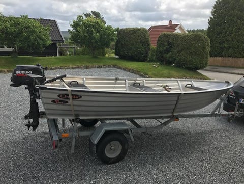 14 fot Kimple Catch 430 aluminiumsbåt med 6hk Suzuki og henger selges samlet