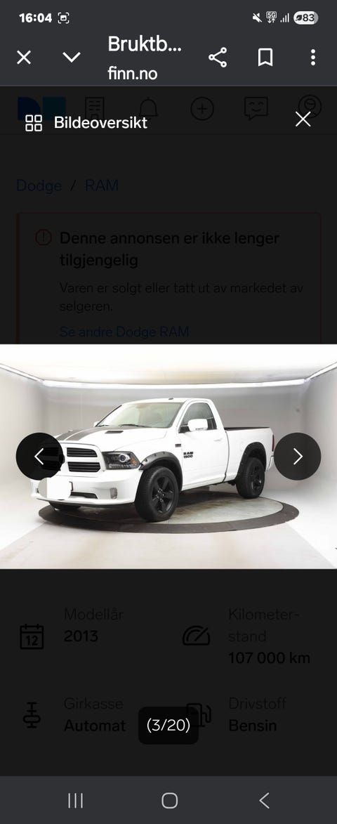 Dodge RAM5.7 hemi2009 ∙ 170 000 km ∙ Bensin ∙ Automat366 900 krHegraPrivat3.12.25Legg til som favoritt.