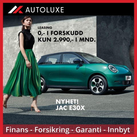 JAC E30XNordic Edition 502024 ∙ 3 102 km ∙ El ∙ 374 km rekkevidde2 990 kr/mndOslo ∙ Automedia ASForhandler24.12.25Legg til som favoritt.