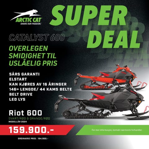 Arctic-cat Riot 600 146" Godkjent for 16-åringer / 5 år garanti2024 ∙ 600 cc159 900 krAlta ∙ CSP Engro - Ditt komplette motor og fritidssenter i Nord-NorgeForhandler ∙ 60 mnd garantiLegg til som favoritt.