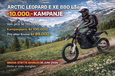 ARCTIC LEOPARD E XE 880 L3e – 37 kW / 880 Nm – KAMPANJE – 89.000,- ETTER ENOVA – NYHET I NORGE – LEVERING KLAR – KRAGERØ2026 ∙ El89 000 krKragerø ∙ MC Sør - Offisiell forhandler av Vmoto / Super Soco og Sur-RonForhandler ∙ 24 mnd garantiLegg til som favoritt.