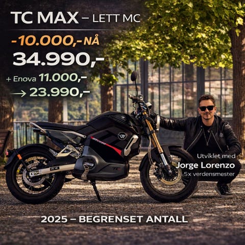 Super Soco TC Max L3e - Kampanje! - Elektrisk lett mc, Fraktfritt levert, Rentefri nedbetaling i 12 mnd, Bergen2025 ∙ El23 909 krBergen ∙ MC Sør - Offisiell forhandler av Vmoto / Super Soco og Sur-RonForhandler ∙ 24 mnd garantiLegg til som favoritt.