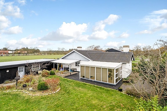 Hyggeligt moderniseret og utroligt velholdt villa med skøn ugeneret have og gode terrassearealer samt stor garage, beliggende for enden af lukket vej. Kun ca. 10 minutters kørsel til Vestehavet og Blokhus, samt under 1/2 times kørsel til Aalborg. Huset er løbende moderniseret med bl.a. vandskuret facade i 2014, moderniseret udestue i 2016, brændeovn i 2016 mv., og fremstår over alt i rigtig flot og indflytningsklar stand. Indeholder brygges med klinkegulv og bord, hyggeligt HTH køkken med hvide låger og nyere gulvbelægning, Spisestue med nyere gulvbelægning, pillebrændeovn og udgang til haven, godt soveværelse med parketgulv og skydelågegarderobe, lyst badeværelse med klinkegulv med gulvvarme og bruseniche, stor stue med parketgulv og nyere brændeovn samt udgang til udestue med trægulv, termovinduer og 3-lags termotag, stort værelse (oprindeligt 2 værelser) med skydelågegarderobe.Desuden stor garage med el-port, isoleret depotrum med tæppe på gulv og redskabsskur. Der er ikke bopælspligt på huset, hvorfor dette også kan anvendes som fritidsbolig.En virkelig velholdt villa, der bare skal opleves!