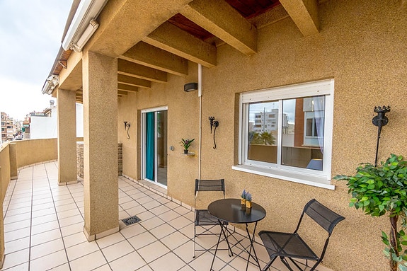 Koselig toppleilighet med 3 soverom, hovedsoverommet med eget bad og direkte tilgang til terrassen, pluss et ekstra bad. Stuen er romslig og kjøkkenet er uavhengig, begge med tilgang til en spektakulær hjørneterrasse, perfekt for utendørs frokoster, avslappende øyeblikk eller familiesammenkomster. Dette hjemmet vender mot sør, og er varmt og solrikt hele året. Boligen selges møblert og utstyrt med hvitevarer, klar til å flytte inn.