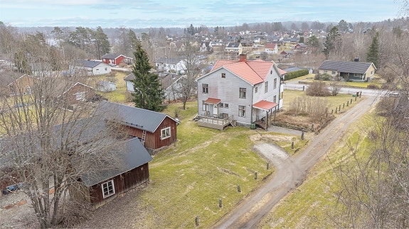 Strax utanför Ed centrum finner vi denna fastighet med flertalet byggnader på rymlig tomt. Bostadshuset om två plan består av hela nio rum, kök och badrum. I tillägg finns tre komplementbyggnader på tomten innehållandes förråds- verkstads- och garageutrymmen. Här erbjuds ett bra tillfälle för dig som söker ett rejält boende med många rum och samtidigt bedriver utrymmeskrävande verksamhet, eller söker generösa utrymmen för lagring och förvaring. En bra möjlighet för dig som både vill bo och driva ditt företag på samma adress.