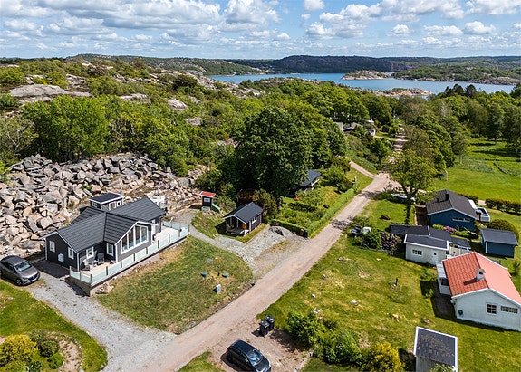 Huset ligger på en grönskade tomt med gräsytor, inslag av träd samt bohuslänsk kaprifol. I bakkant av tomten finns spår från stenhuggartider med stora granitblock som ger tomten karaktär och dynamik. Exteriört finns även en större vidbyggd altan i soligt söderläge som skapar en inbjudande och trevlig utemiljö. Möjlighet att parkera flera bilar på tomten samt en fristående förrådsbyggnad för förvaring. Fiber finns installerat.