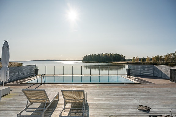 Bostadens terrasser nås från köket och ytterligare fyra rum samt teknikrummet. Terasserna har plats för utekök, loungegrupp, middagsmöbel och solgrupp och det finns ett förråd för dynor på husets kortsidan. Den upphöjda terassen med saltvattenspoolen har trädäck, glasräcke mot vattnet och nätt staket på sidorna. Poolen har stensättning runt om, vacker ljussättning och uppvärmning. Terasserna går ner till den egna sandstranden och skapar tillsammans en helhet till detta paradis vid Vänern