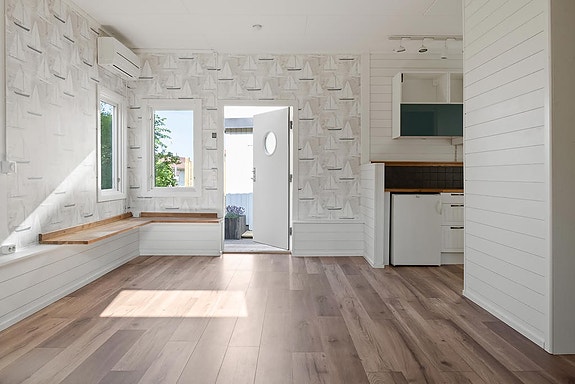 Bostadens 35 kvadratmeter disponerar sig över allrum/kök, sovalkov, samt ett badrum med dusch samt ett förrådsrum. Uteplats finns vid entrédörren mot innergården och väst. Lägenheten värms upp med en luft/luft värmepump samt vattenburen golvvärme. Kanske kan lägenheten gå på uthyrning och således bli en extra inkomstkälla?