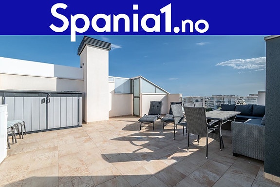 Velkommen til en moderne toppleilighet i det populære boligkomplekset Green Hills. Leiligheten har tre soverom med totalt seks sengeplasser, to bad og en åpen stue- og kjøkkenløsning. Fra stuen er det utgang til en solrik balkong, og via egen trapp har du tilgang til en privat takterrasse på ca. 50 m² med utekjøkken, grill og møbler – perfekt for solrike dager og kvelder ute.