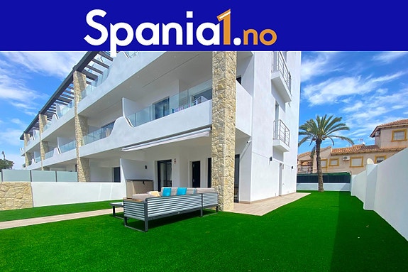 Spania1 har gleden av å presentere en moderne hjørneleilighet i første etasje med stor tomt – i et ettertraktet og utsolgt boligområde.