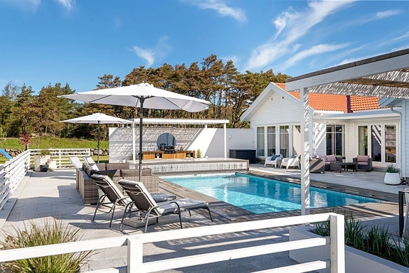 Uteplatsen kring poolen är insynsskyddad och erbjuder gott om plats för sittgrupper och solbäddar, vilket gör den till den perfekta platsen för socialt umgänge och avkoppling under varma sommarkvällar. Poolen har ett inbyggt, tekniskt poolrum som stänger ute ljud och optimterar poolens prestanda.