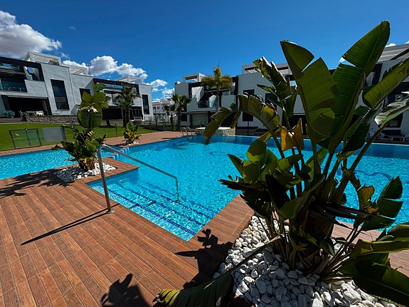 Denne eiendommen har utsikt over den store hagen og fellesbassenget på Oasis Beach 9. Den har 2 soverom, 2 bad og en underjordisk parkeringsplass. Badene har gulvvarme, varmt/kaldt klimaanlegg og elektriske persienner. Det ligger i Los Altos, med lett tilgang til Torrevieja og strendene i Orihuela Costa, og innen gangavstand fra mange barer og restauranter. Det er også en sesongbasert leietillatelse for eiendommen.