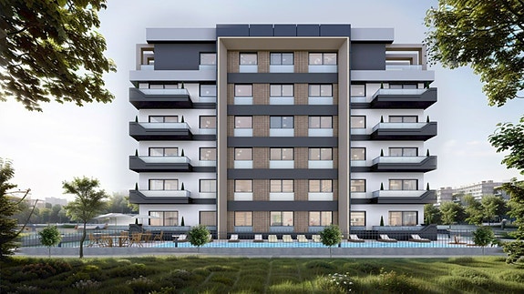 Komplekset der leilighetene til salgs ligger har et svømmebasseng, anlagte områder, sittegrupper, utendørs parkering og et smart heissystem.