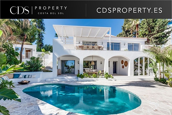 Denne fullstendig renoverte villaen i det populære Nueva Andalucía-området tilbyr 5 soverom, 4 bad og fantastisk fjellutsikt. Med skandinavisk kjøkken og privat basseng er dette et ideelt familiehjem.