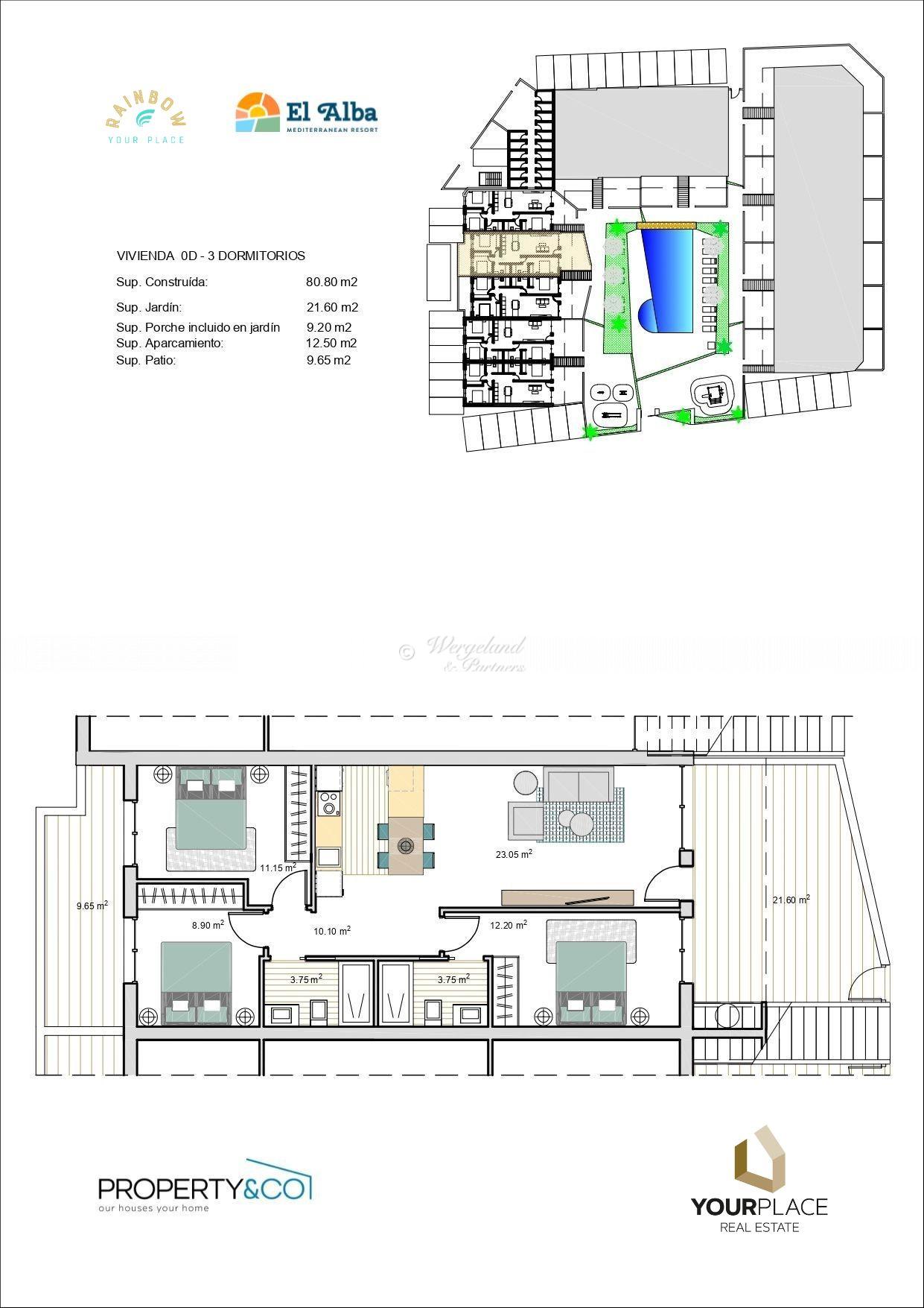 Rainbow Bungalows – Velg mellom 3 sov/2 bad i bakkeplan, som denne, eller 2 sov/2 bad i toppetasje m. taketrrasse og utekjøkken. Felles basseng. Biloppstillingsplass og mulighet for å kjøpe bod (9.900€).