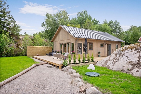 Välkommen till fritidshusområdet Krossnäs strax söder om Strömstad. Här finner ni ett nybyggt fritidshus från 2025. Huset har tre sovrum med gott om sovplatser, härliga och ljusa umgängesytor i allrum med stora fönsterpartier. Det finns flertalet LED-spotlight i tak och öppen lösning mot komplett utrustat kök, tillsammans med kaklat badrum med klinkers och golvvärme samt gästtoalett. Huset har genomgående ljusa och fräscha ytskikt i vitt och grått och är smakfullt byggt med träfasad behandlad med Jotun Trebitt oljebeis i rökgrå färg och grått plåttak samt matchade grå alu-profiler på fönster utvändigt. Huset kommer även att utrustas med gavelfönster på övre plan på båda sidor, innan försäljning. Från kök/ allrum finns altandörr ut mot den vackra naturen och uteplatsen.