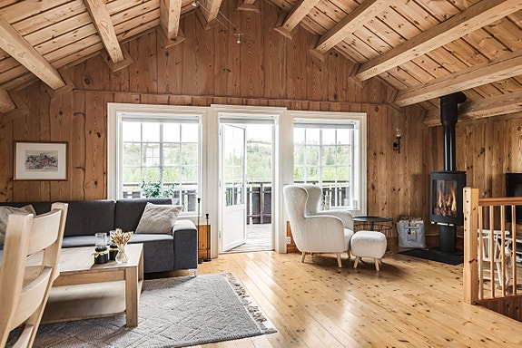 Den charmiga inredningen skapar en varm och inbjudande atmosfär. Den grova fjällpanelen har en nordisk känsla medan stenväggarna i hallen ger en rustik atmosfär. Övre plan erbjuder kök, matplats och vardagsrum i öppen planlösning, där en kamin finns centralt placerad. Från vardagsrummet finns utgång till stor balkong i sydväst. Köket är modernt utrustat med alla nödvändiga vitvaror och har utsikt över det vackra landskapet.