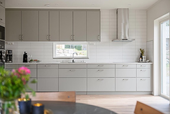 Det öppna köket i denna ljusa och rymliga bostad är perfekt för den moderna familjen. Med sin gråa och stilrena design, rostfria vitvaror och generösa förvaringsutrymmen blir det lätt att laga och njuta av måltider tillsammans. Med flera fönster i olika väderstreck fylls rummet med naturligt ljus. Här finns även gott om plats för både matbord och soffgrupp, vilket gör det till en idealisk plats för umgänge och avkoppling.