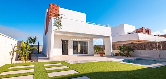 Flotte design villaer bare 2 km fra strendene i Torre de la Horadada. Hele 3 soverom og 3 bad med hage, balkong og takterrasse ! Privat basseng ! Parkering på egen tomt. Gåavstand til alt man trenger i hverdagen.