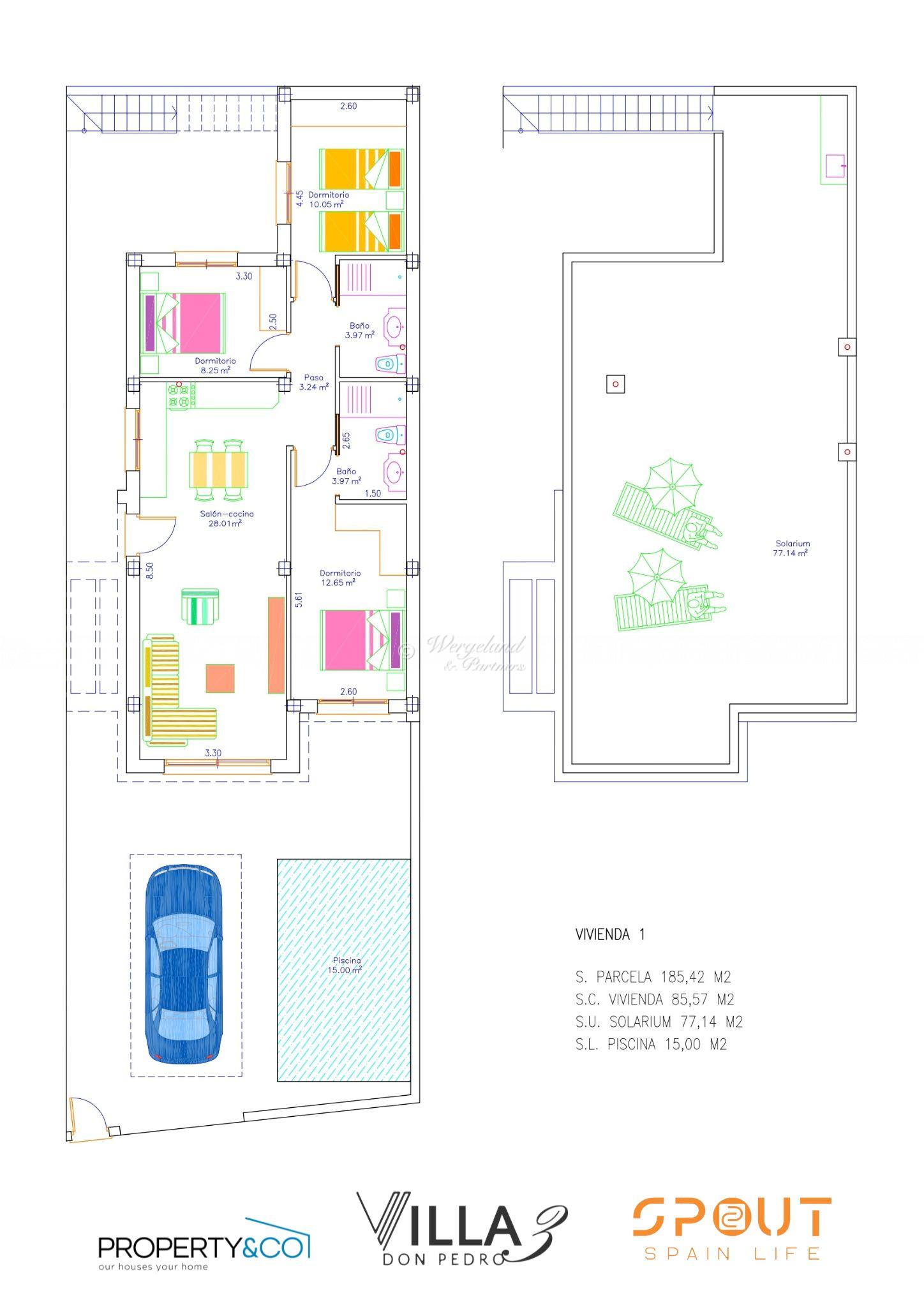 Prosjektet består av seks villaer, alle med 3 sov/ 2 bad, 85 m2 på et plan. Hjørnekjøkken mot spisestue og stue. 3 sov/2 komplette bad. Utgang til flislagt uteområde med privat basseng. Utvendig trapp til 77 m2 takterrasse med utekjøkken. Biloppstillingsplass på tomten.