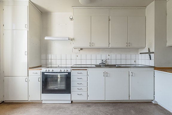 Trivsamt kök med gott om förvaring, vita släta köksluckor, rostfri bänkskiva och kakel som stänkskydd. Den maskinella utrustningen består av spis, spisfläkt samt kyl/frys.