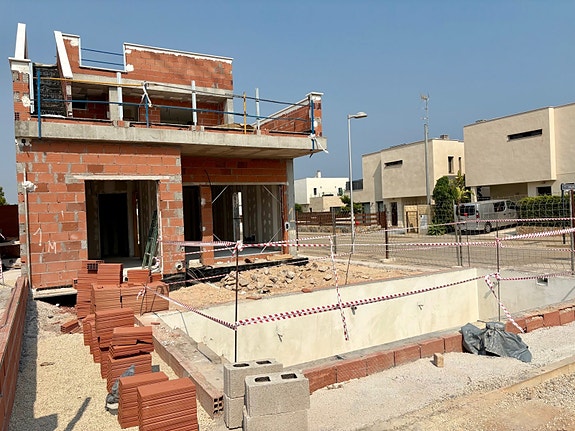 Felles for alle de 8 villaene er at de er sørvestvendte, har flere terrasser, inkl. takterrasse på 45 m2. Bildene i annonsen er fra visningshuset og denne villaen under bygging (august 2025)