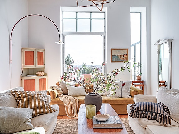 Det generösa vardagsrummet är hemmets naturliga samlingspunkt med sin imponerande takhöjd på över 3,60 meter och ett fantastiskt ljusinsläpp från de stora fönsterpartierna. Rummet ramas in av den unika stavparketten i valnöt och golvvärmen som löper genom hela bostaden skapar en behaglig komfort året om. Härifrån nås även den stora terrassen med panoramavy över havet, stadens takåsar och horisonten – en plats att njuta av från morgon till kväll.
